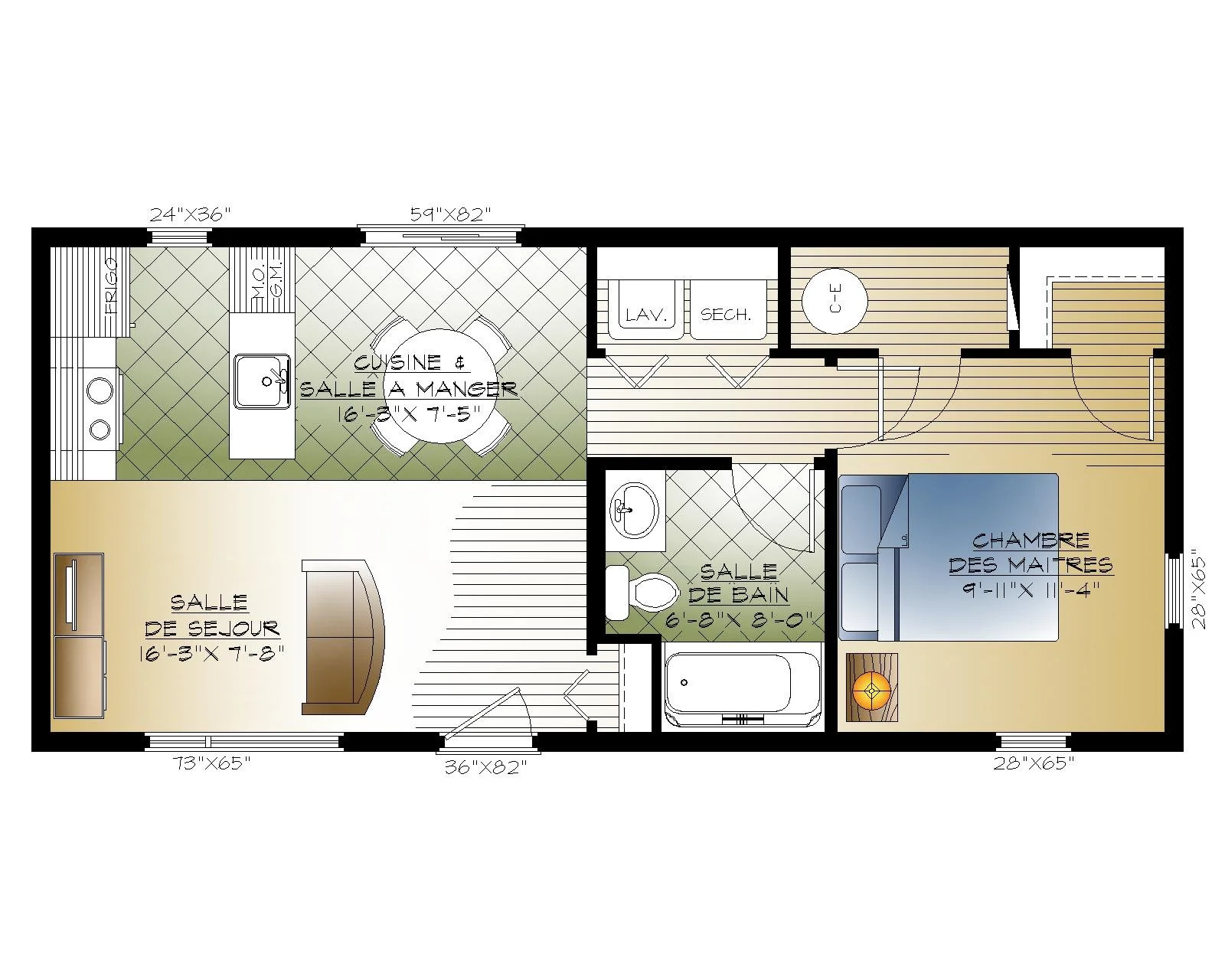 Superficie 560 pi2 Dimension 35’ x 16’ Chambres 1 Salles de Bain 1 DUOSimple, compacte et bien pensée, la duo offre tout le nécessaire sans superflu. Son aménagement intelligent maximise chaque mètre carré DEMANDEZ UNE SOUMISSION Diapositive 1 Diapositive 1 (diapositive actuelle)